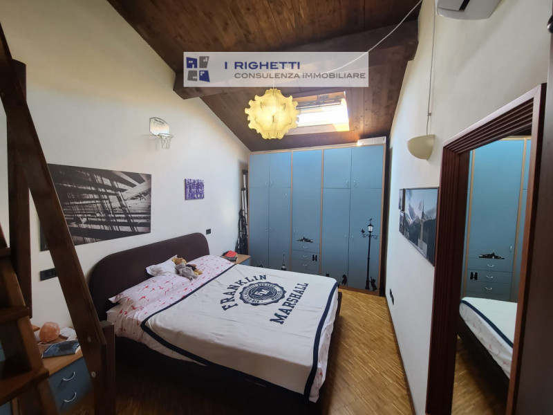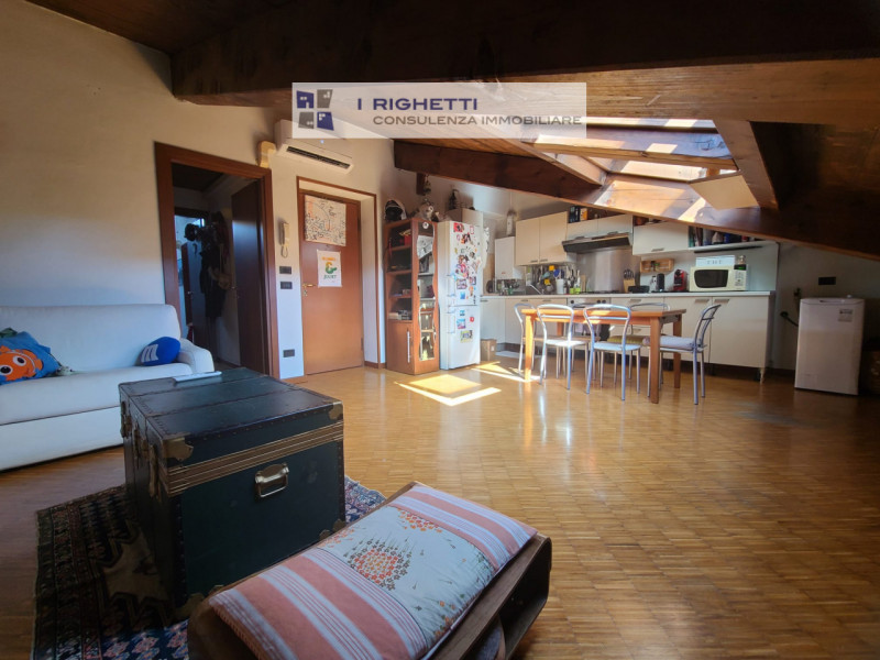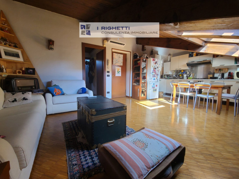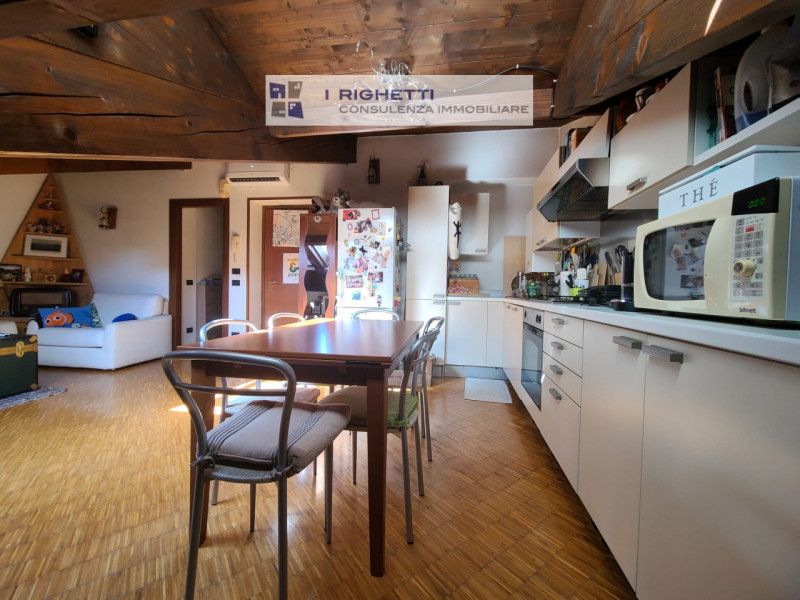 L'appartamento si presenta luminoso e arioso grazie alle ampie finestre velux che illuminano gli spazi interni. La zona giorno è caratterizzata da travi a vista in legno che conferiscono un tocco rustico ed elegante all'ambiente. La cucina open space è completamente attrezzata con elettrodomestici moderni e offre uno spazio ideale per pranzare o intrattenere amici.